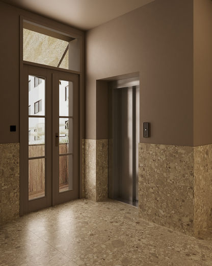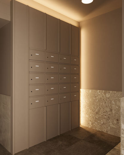 Zázemí domu doplňuje terasa ve vnitrobloku pro rezidenty, sklepní kóje